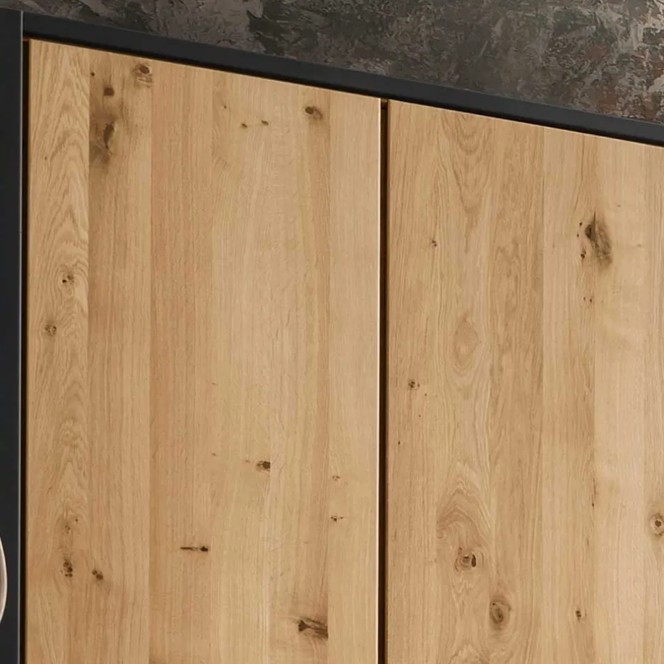 - Aus Wildeiche Massivholz (Kopfteil, Fronten) und Spanplatte (Wange, Bettseiten, Korpus, Einlegeböden) gefertigt