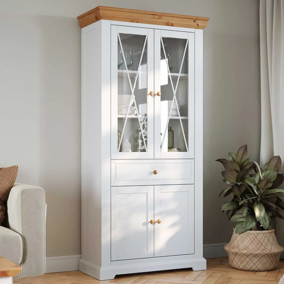 - Oberflächen weiß lackiert mit 85 % Deckkraft, Maserung leicht durchscheinend, RAL 9003, kieferfarbene Elemente gebeizt und lackiert