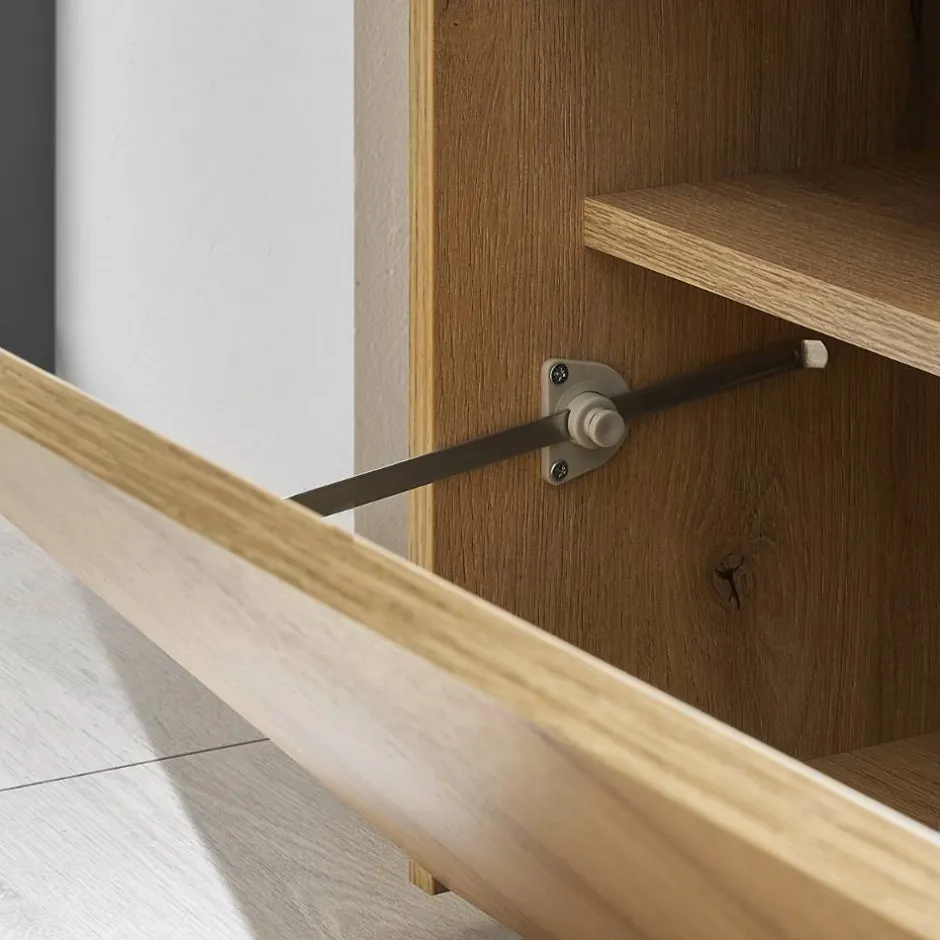 - Eine Klappe, innen vier Fächer, Platz für bis zu acht Paar Schuhe