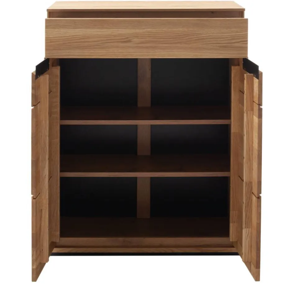 - Massivholz geölt, Holzwerkstoff außen echtholzfurniert und geölt, innen in Holzoptik foliert