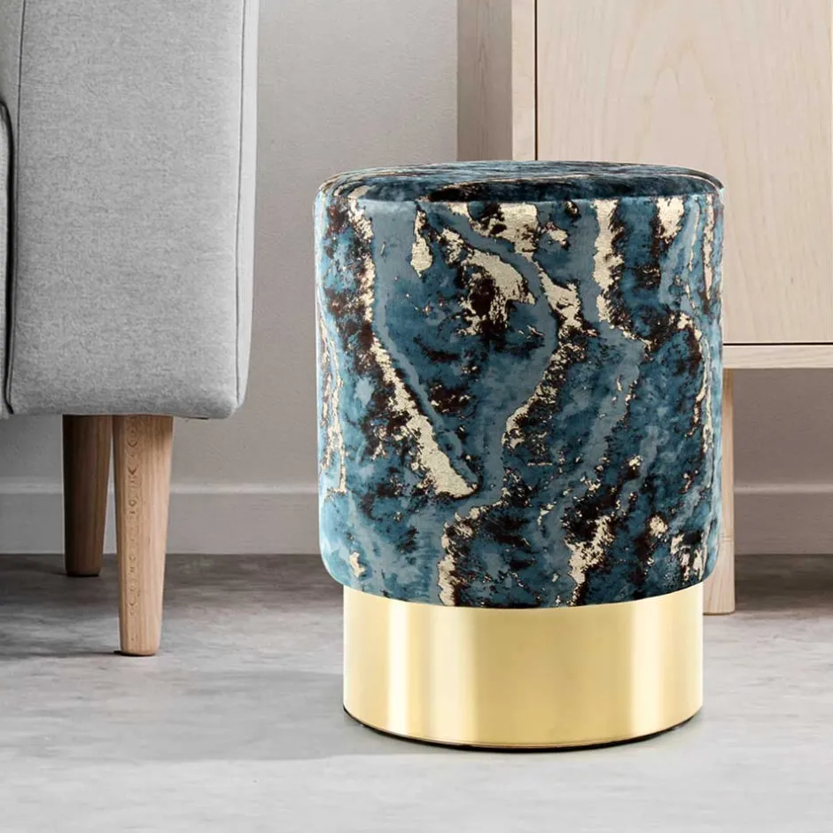 - Design Polsterhocker in Dunkelblau und Goldfarben