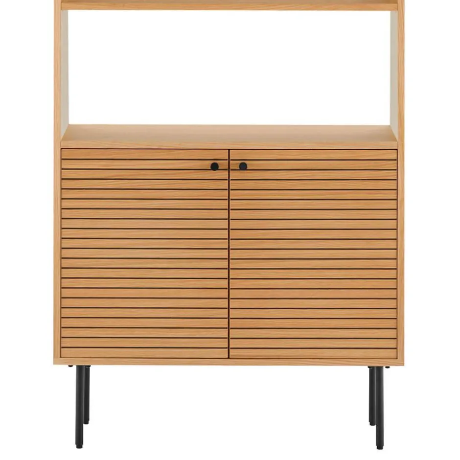 - Im offenen Bereich drei feste Einlegeböden mit Blende an der Rückwand, damit nichts herunterfällt