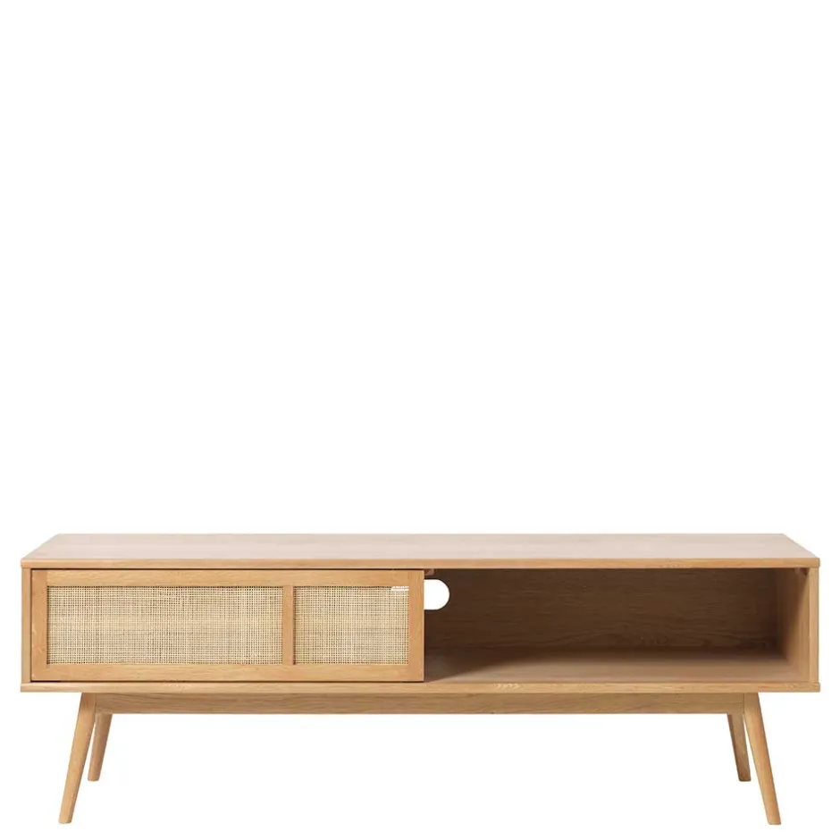 - Aus Holzwerkstoff, Eiche Massivholz und Rattan gefertigt