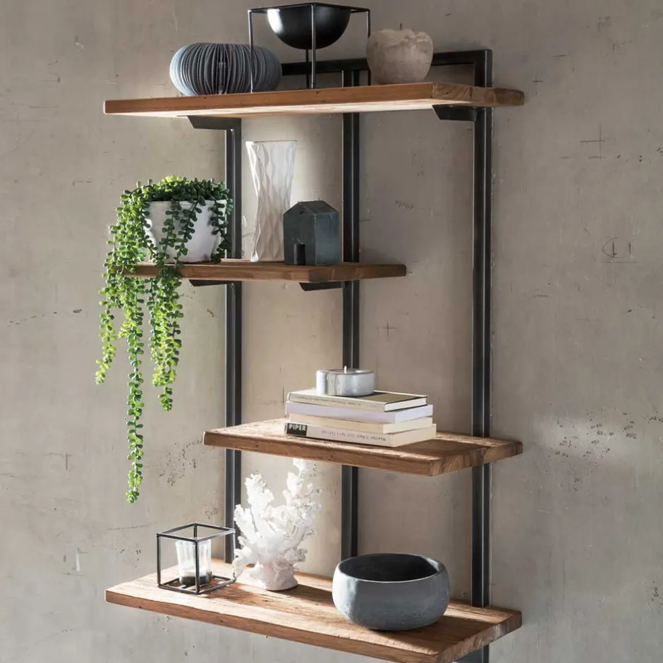 - Ein Metallrahmen mit vier unterschiedlich großen Holzböden, versetzt angeordnet
