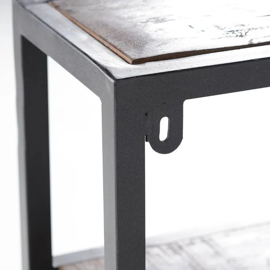 - Holz-Oberflächen mit bunten Lackresten unikat gestaltet, Metallrahmengestell in Antikschwarz