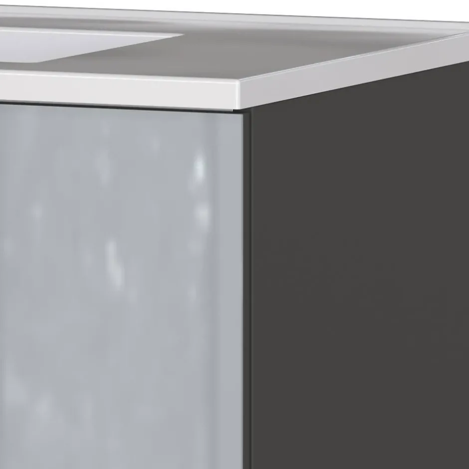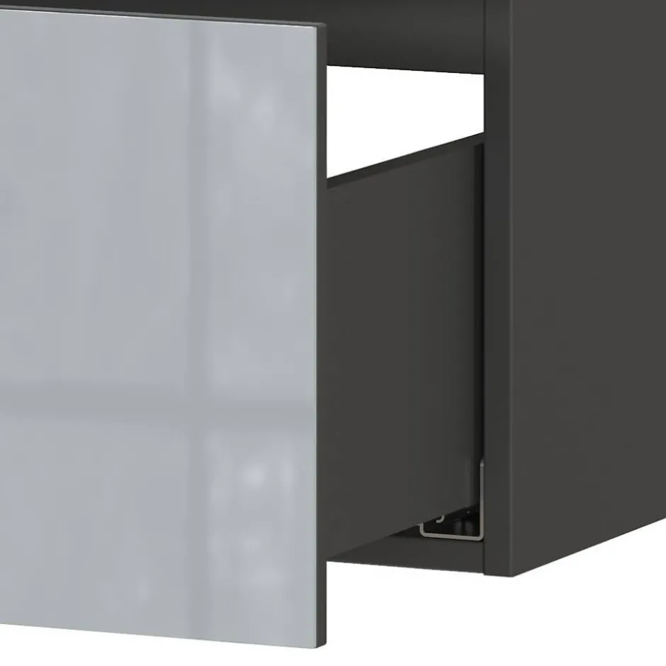 - Oberflächen in Dunkelgrau melaminbeschichtet, Front mit Glas in Silbergrau beschichtet