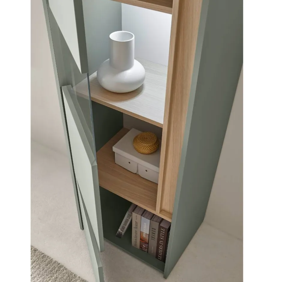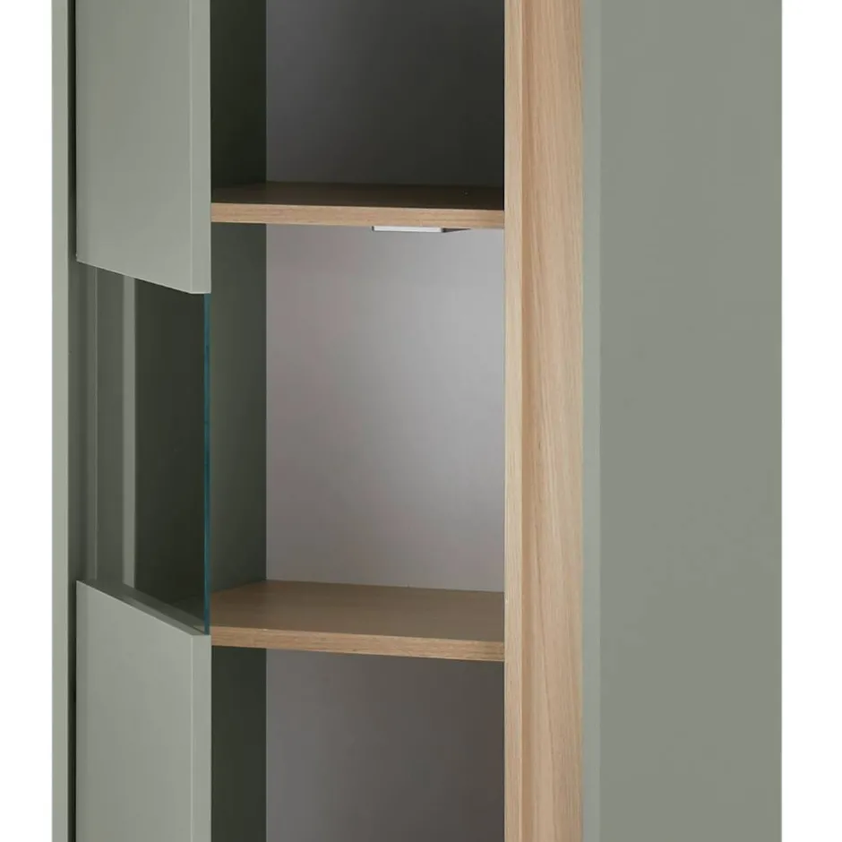- Trendige Vitrine in Graugrün und Eichefarben