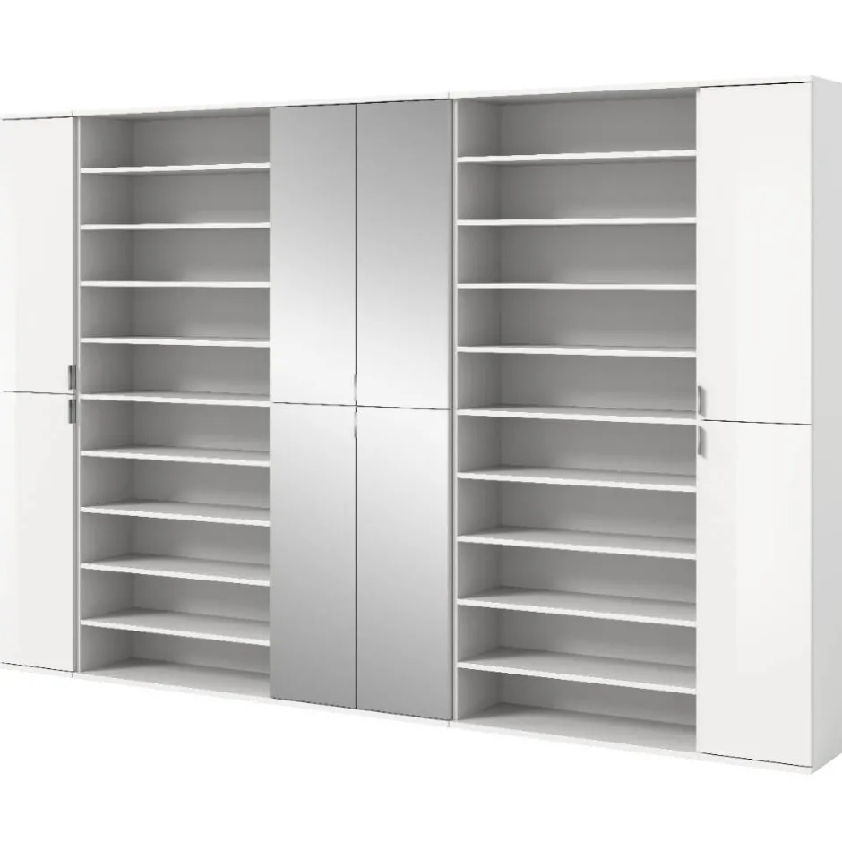 - Besteht aus zwei Hochschränken, zwei Regalen und einem Spiegelschrank