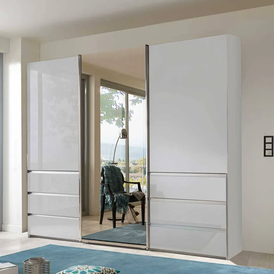 - Oberfläche der Front mit weißem Glas beschichtet, Korpus foliert, Innendekor in Silber-Grau gestreift