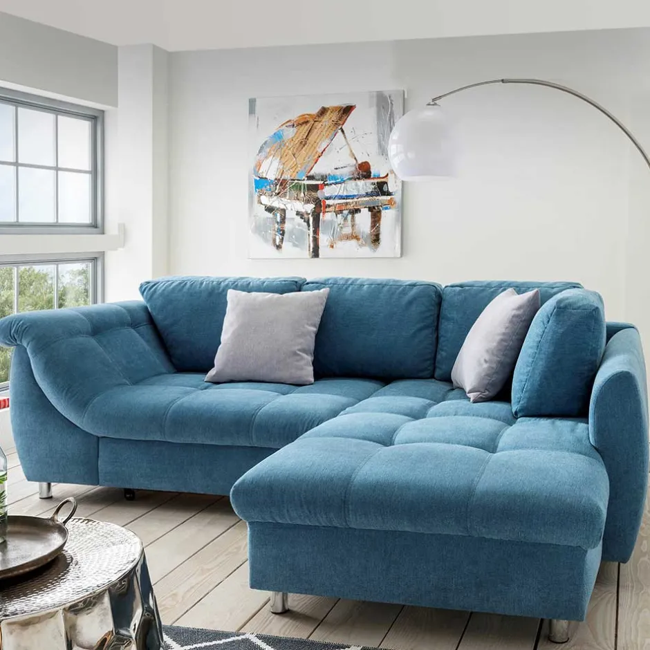 - Stylisches Ecksofa in Blau, Silber- und Chromfarben
