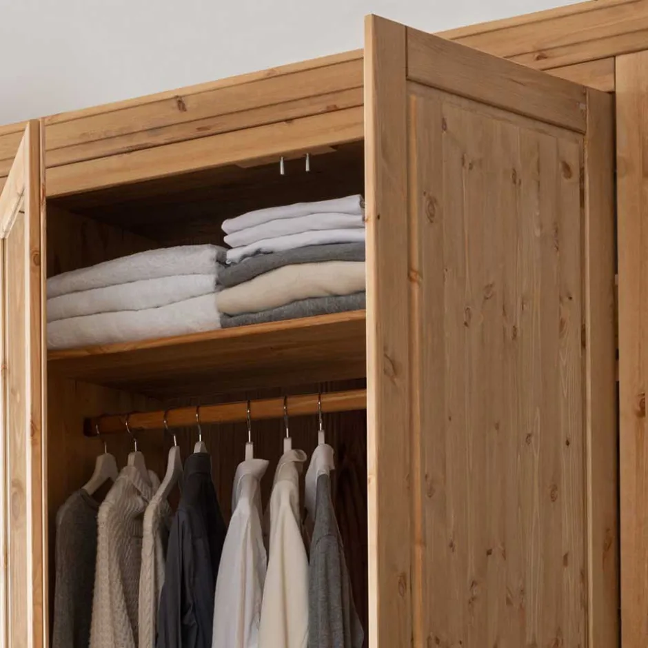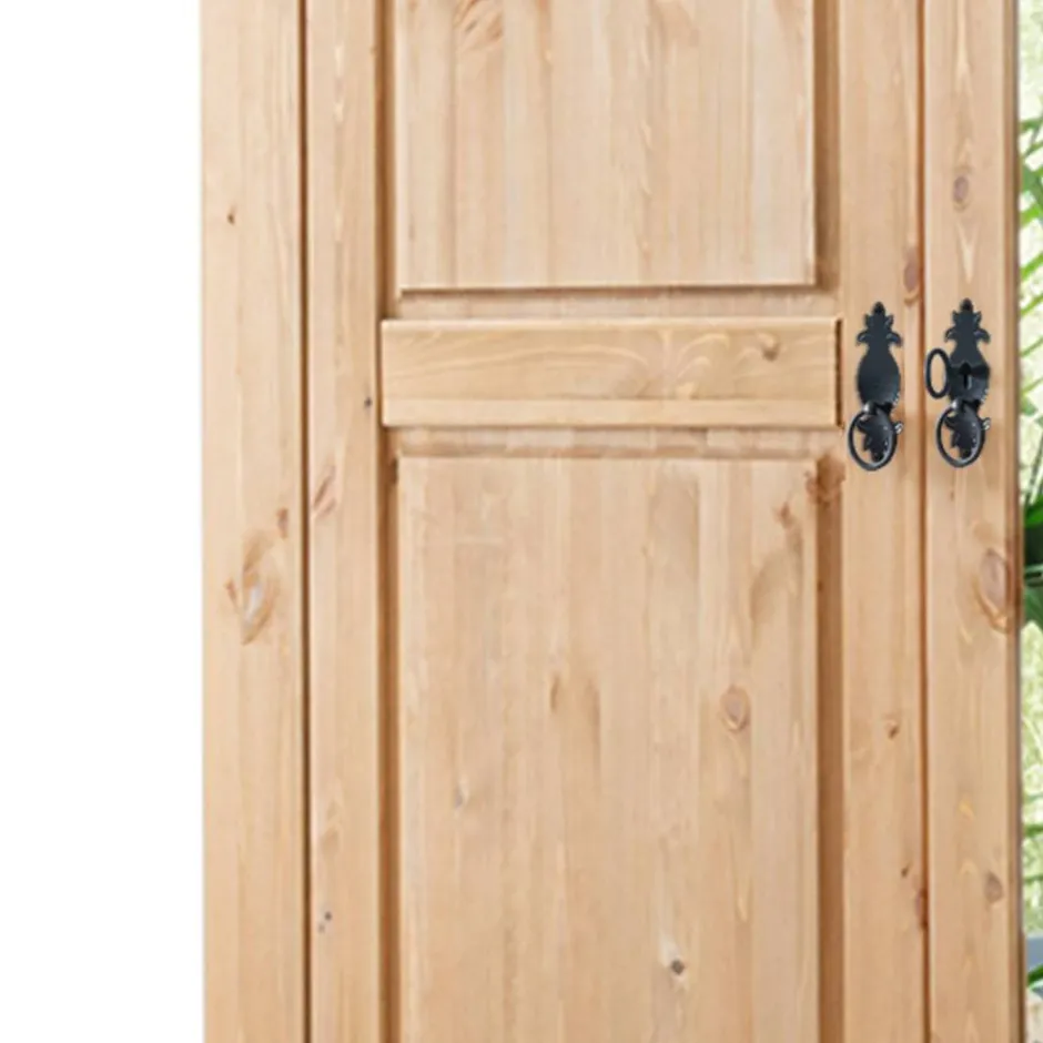 - Innen befinden sich zwei Kleiderstangen und fünf Holzböden