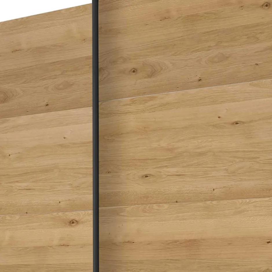 - Aus Wildeiche Massivholz (Kopfteil, Fronten) und Spanplatte (Wange, Bettseiten, Korpus, Einlegeböden) produziert