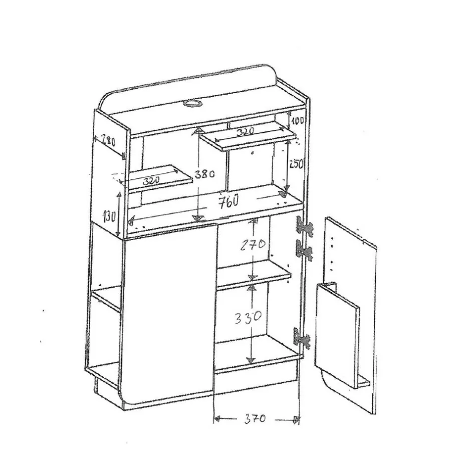 - Zwei Türen unten mit Metallbeschlägen, dahinter ein Einlegeboden