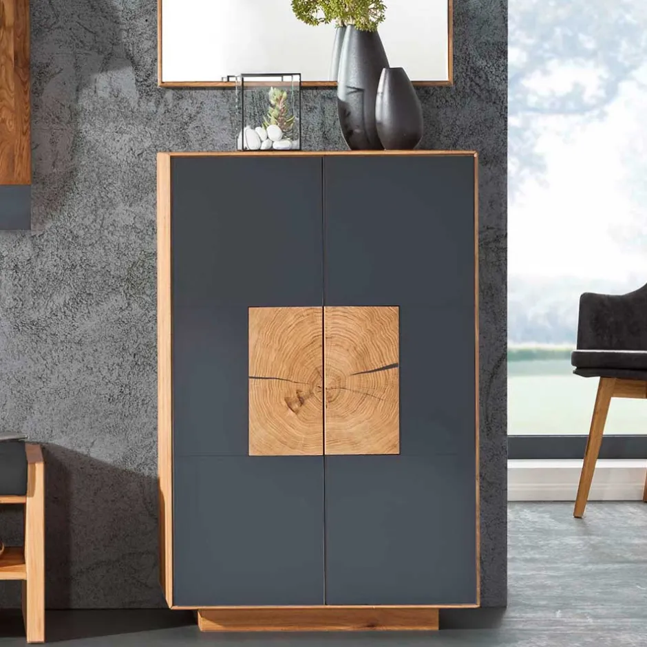 - Front aus MDF mit einer Auflage aus satiniertem Glas in Anthrazit und einer unikaten Applikation aus Hirnholz
