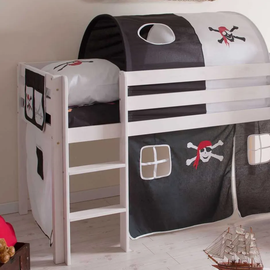- Weißes Hochbett mit Vorhang-Set in Schwarz-Weiß mit Piratenmotiv
