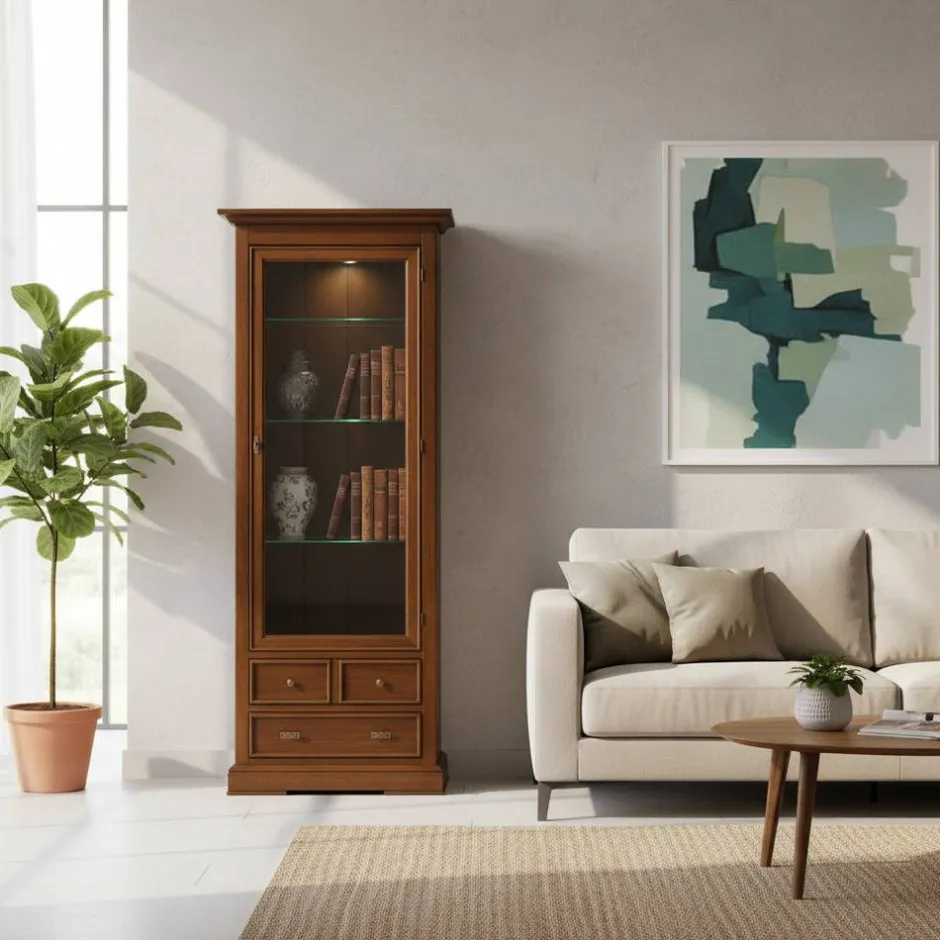 - Stilvoll präsentiert sich der Vitrinenschrank in warmen Walnusstönen