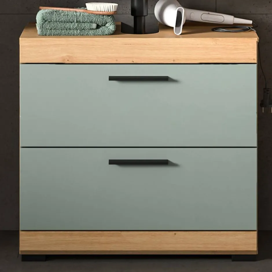 - Kompakter Waschbeckenschrank in Salbei und Wildeichefarben