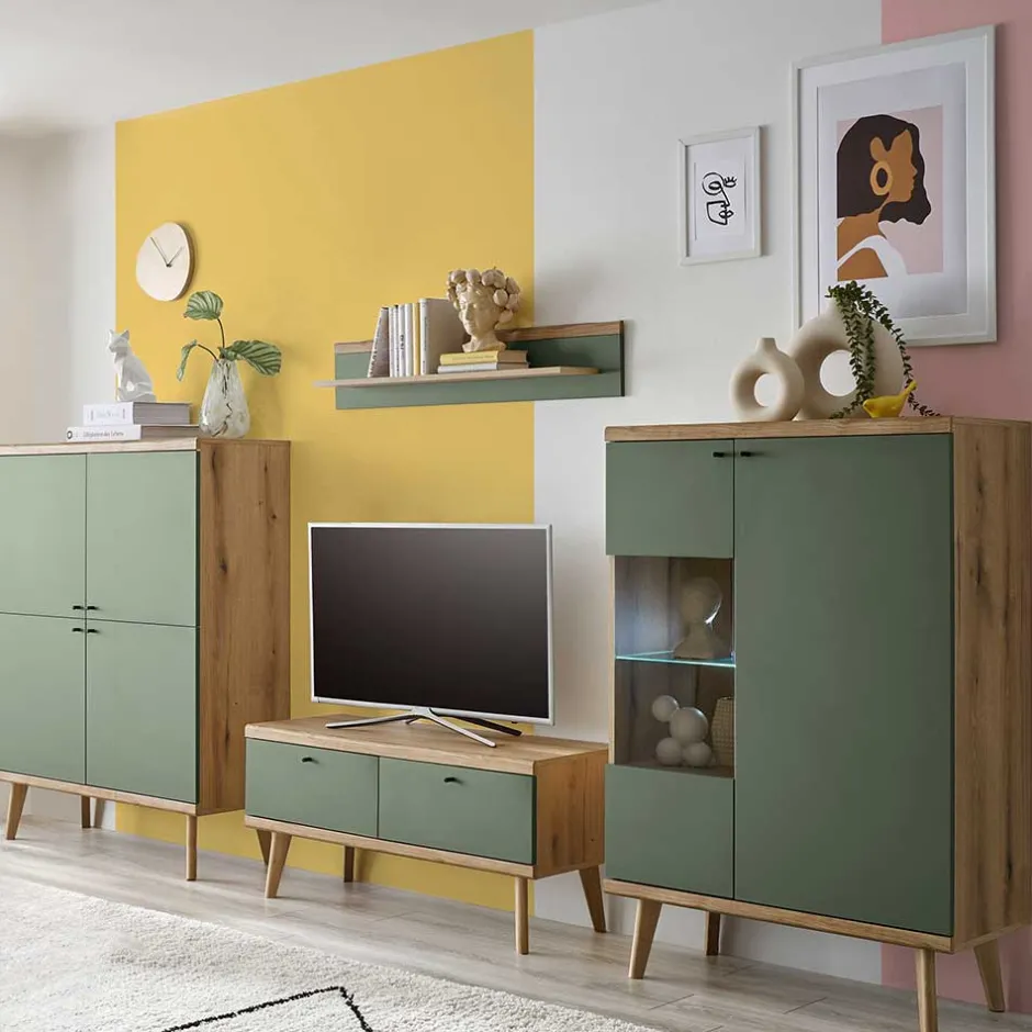 - Trendstarke Wohnwand in Graugrün und Wildeichefarben