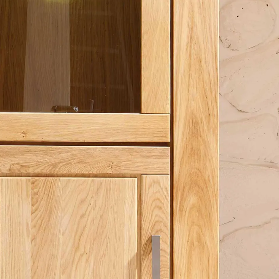 - Türrahmen, Schubladen und Rahmen der Seiten aus Wildeiche Massivholz, restliche Teile aus solider Spanplatte