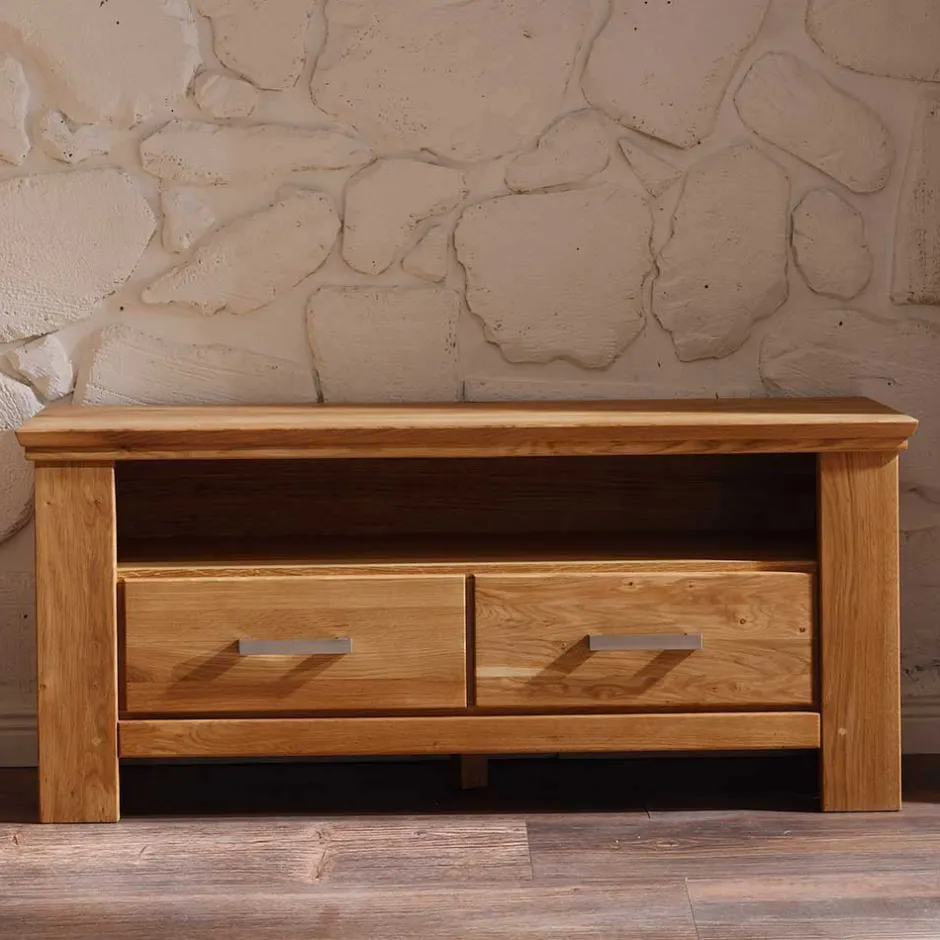 - Oberplatte, Türrahmen, Schubkästen und Rahmen der Seiten aus Wildeiche Massivholz, Rest aus Spanplatte