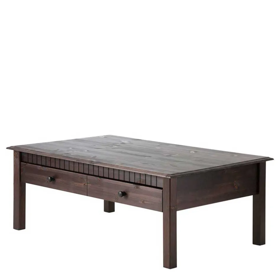 - Solide Tischplatte mit markanter Holzmaserung und dekorativ gefräster Blende