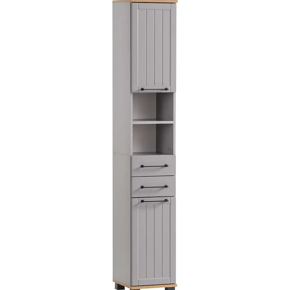 - Geräumiger Bad Hochschrank in Platingrau und Eichefarben