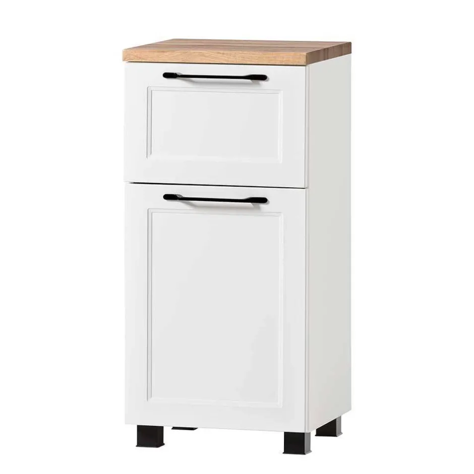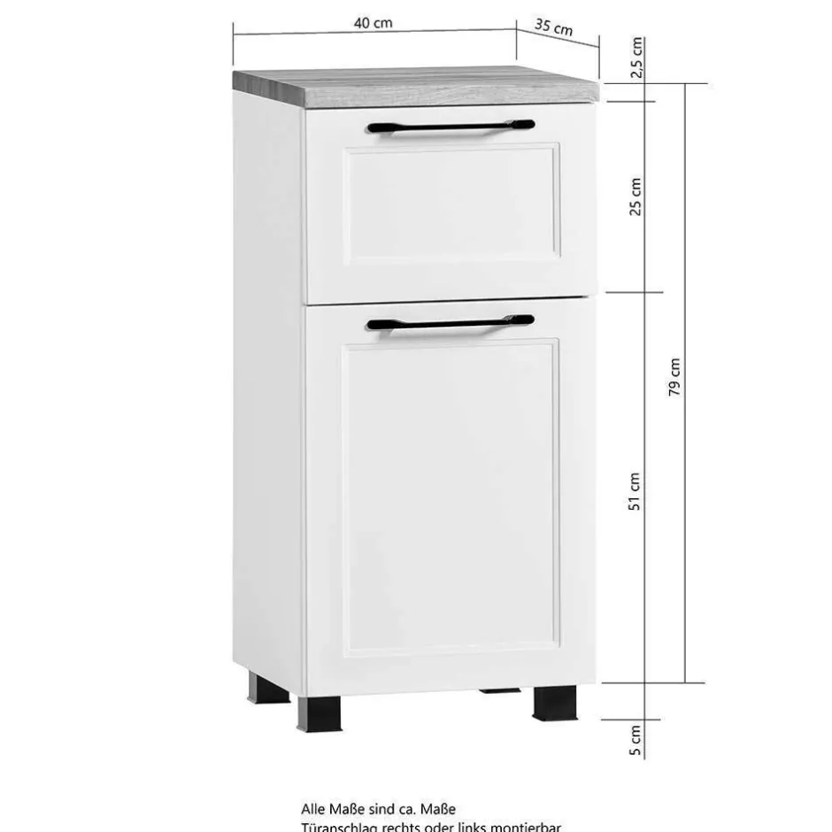 - Korpus melaminbeschichtet in Weiß und Holzoptik, Front weiß matt foliert
