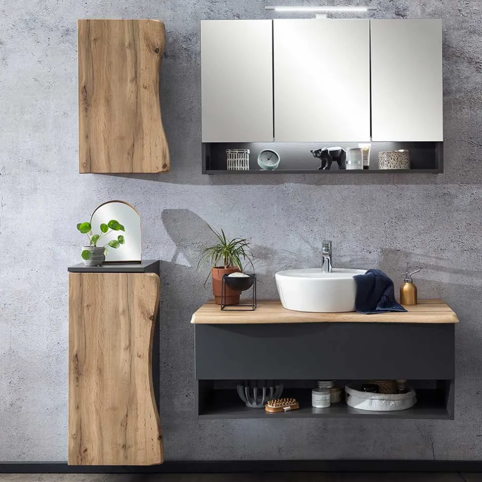 - Badmöbel Ensemble in Dunkelgrau und Wildeichefarben mit Baumkantenoptik