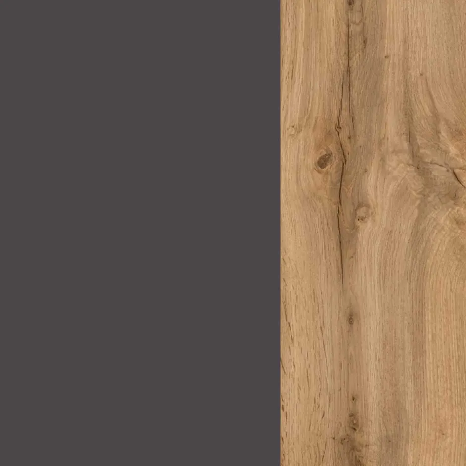 - Oberflächen in Holzoptik Wildeiche mit Touchwood melaminbeschichtet, Front in Dunkelgrau foliert, Kanten tiefgezogen, Innendekor weiß