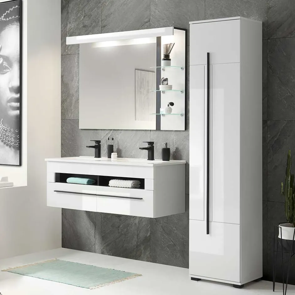 - Gefertigt aus MDF (Front), Spiegelglas und Spanplatte (Korpus)