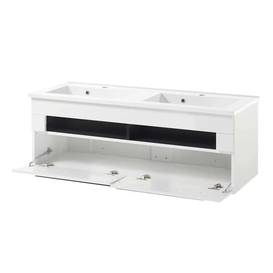 - Leicht zu pflegender Doppelwaschtisch aus Mineralguss, mit Ablauflöchern