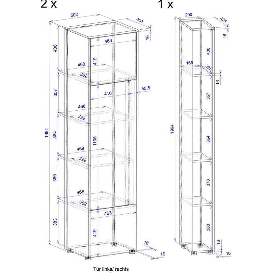 - Hinter den kleinen Türen jeweils ein Staufach, mittig vier Einlegeböden