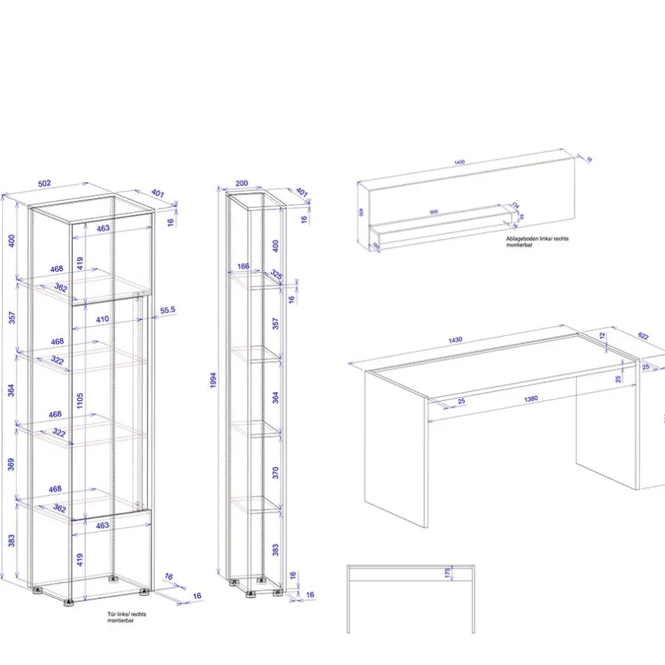 - Wandmontage sowie Wangengestell und flache Kunststoffgleiter, zusätzliche Kippsicherung an der Wand bei den Korpusmöbeln erforderlich