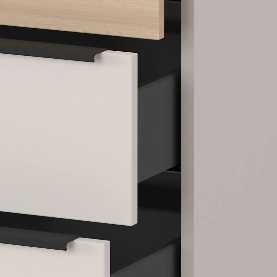 - Drei Schubladen mit Metallauszug und Soft Close Funktion (Selbsteinzug), jeweils bis max. 10 kg belastbar