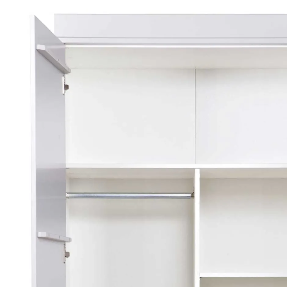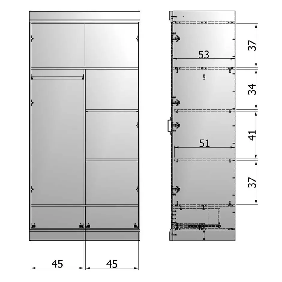 - Links eine Kleiderstange, rechts zwei Einlegeböden, oben ein durchgehender Hutboden