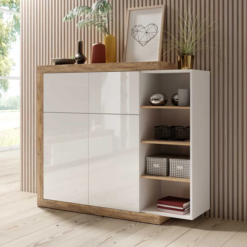- Smartes Highboard in Weiß und Holzoptik Eiche verwittert