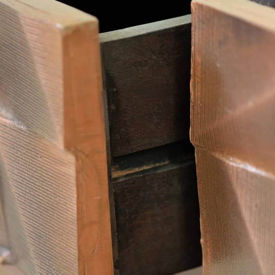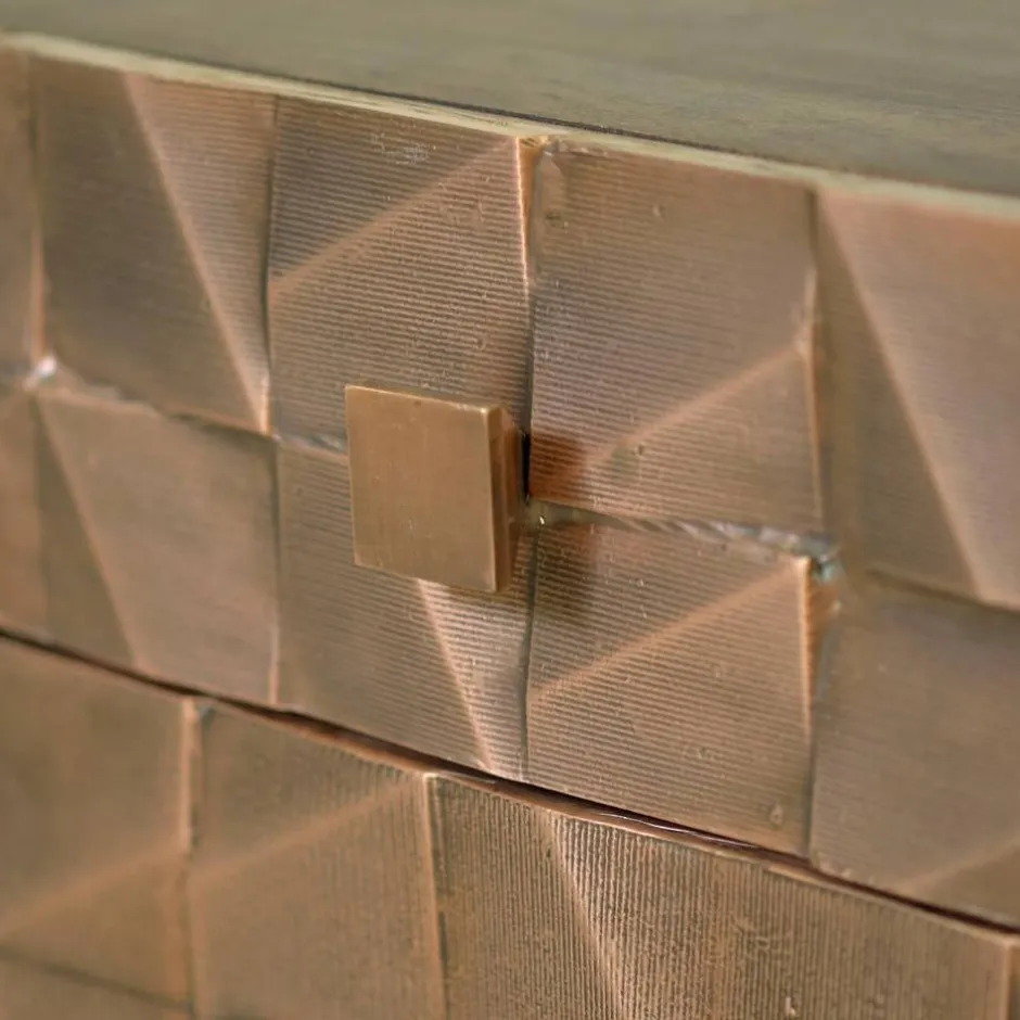 - Plastisch gestaltete Front, Oberflächen von Türen und Schubladen höchst dekorativ mit Metall beschichtet