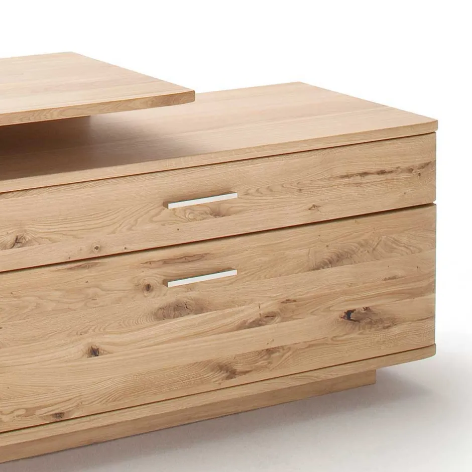 - Massivholz hell geölt, Korpus außen mit Eiche echtholzfurniert und hell geölt, innen foliert in Holzoptik Eiche Bianco, Deckplatte und Sockel vorne und seitlich mit Massivholz Anleimern (22 mm stark)