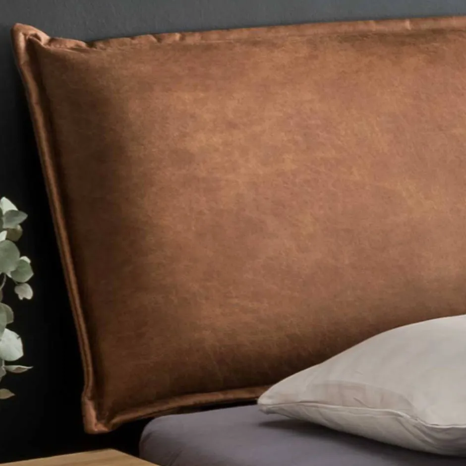 - Schaumstoffgepolstertes Kopfteil in Kissenoptik, Bezug aus braunem Recyclingleder (70 % Leder, 30 % Polyester)
