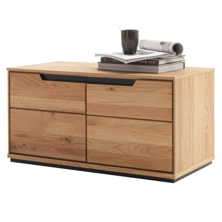 - Massivholz geölt, Holzwerkstoff außen echtholzfurniert und geölt, innen in Holzoptik foliert