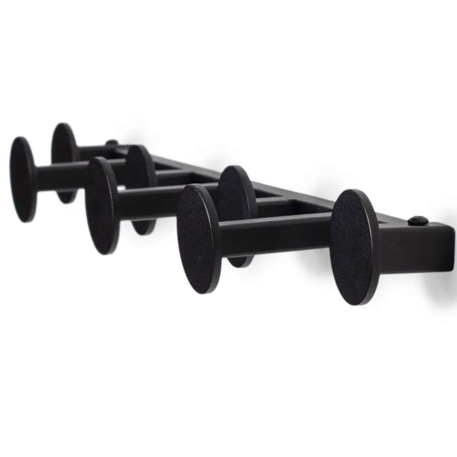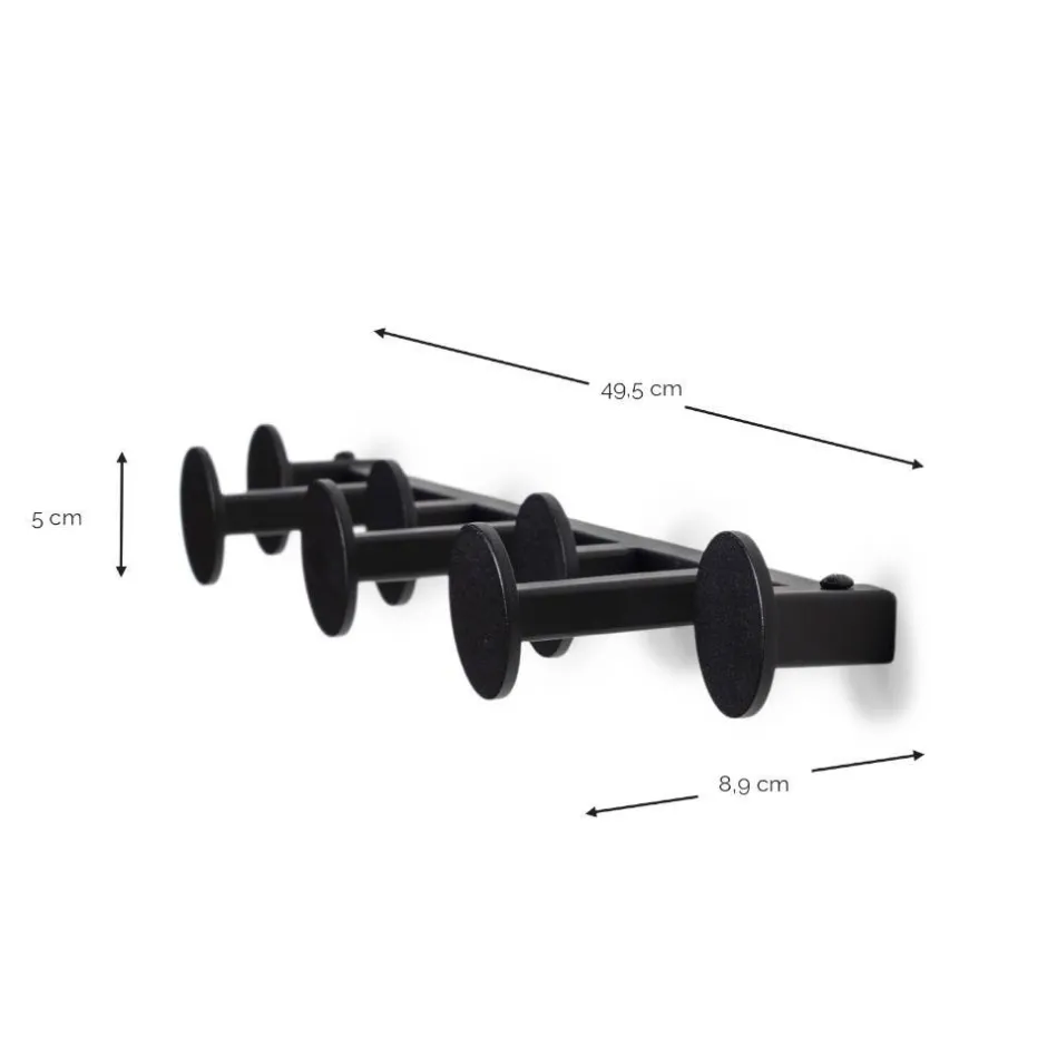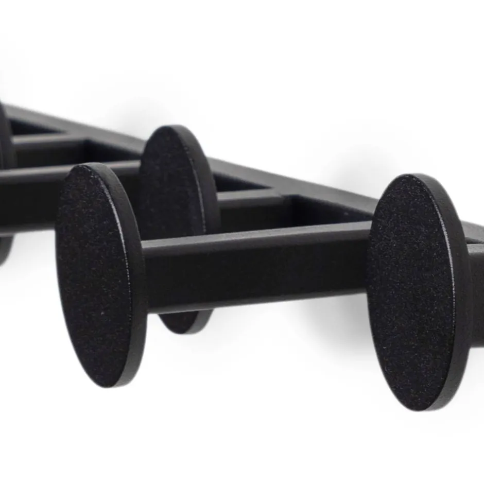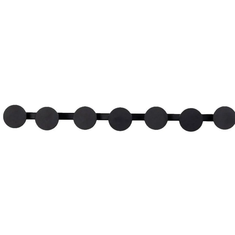 - Sieben runde Kleiderhaken auf unterschiedlichen Höhen