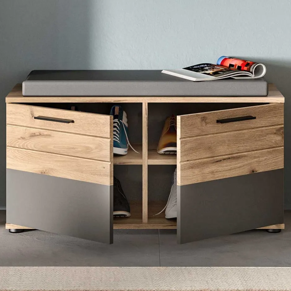 - Kontraststarke Garderobenmöbel in Wildeichefarben und Grau
