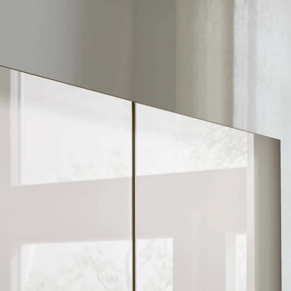 - Sechs Türen aus Holzwerkstoff mit weißer Glasbeschichtung, Bauchbinde Massivholz, Soft Close Metallscharniere