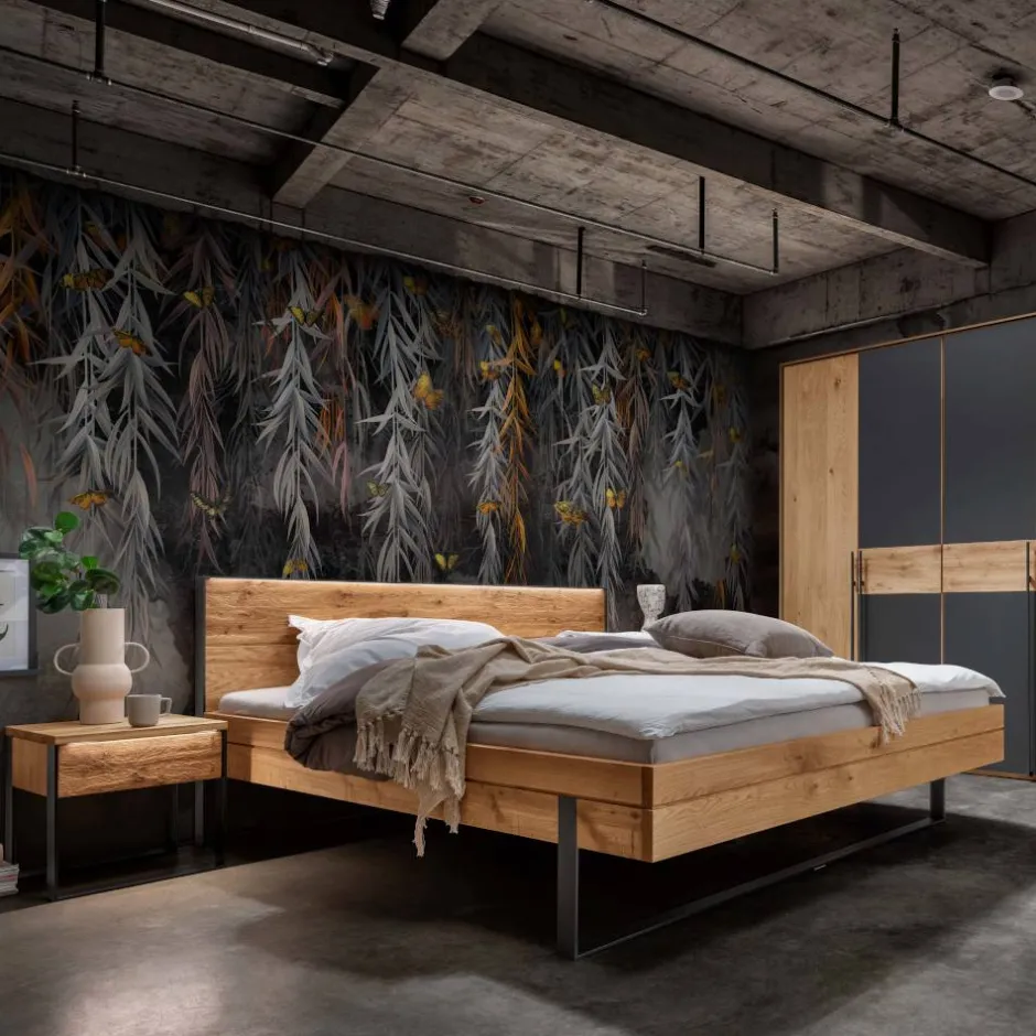 - Markantes Kopfteil mit Metallrahmen und grob sandgestrahltem Holz