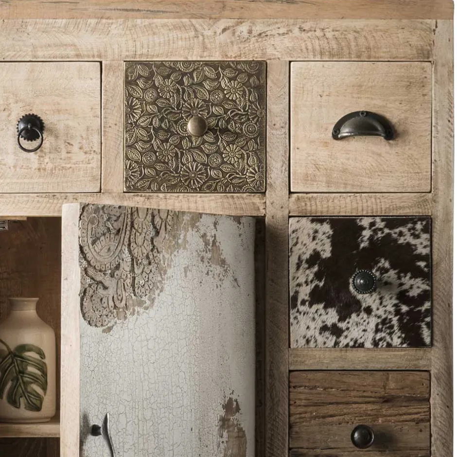 - Holzoberfläche mit White Wash Effekt behandelt, Metall in Schwarz lackiert, Fronten teils mit echtem Ziegenfell und messingfarbigem Metall verziert