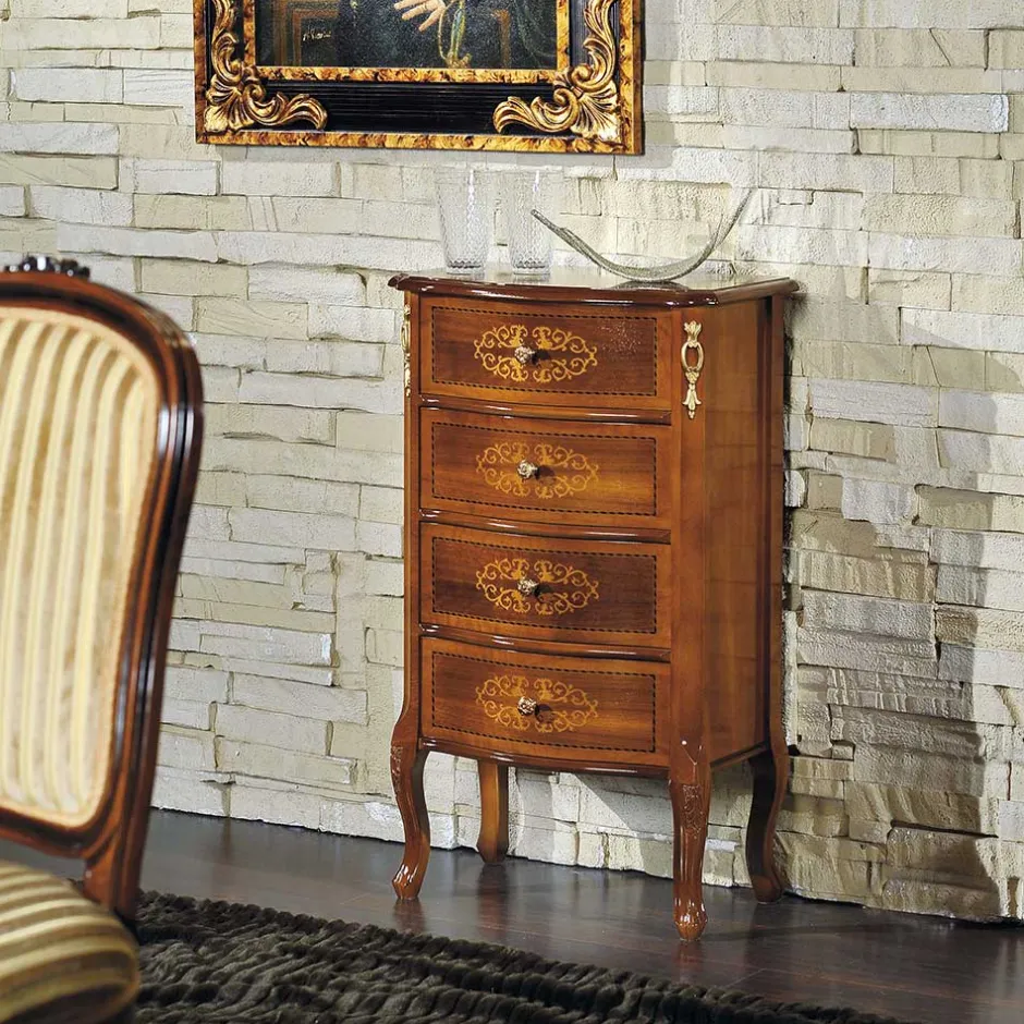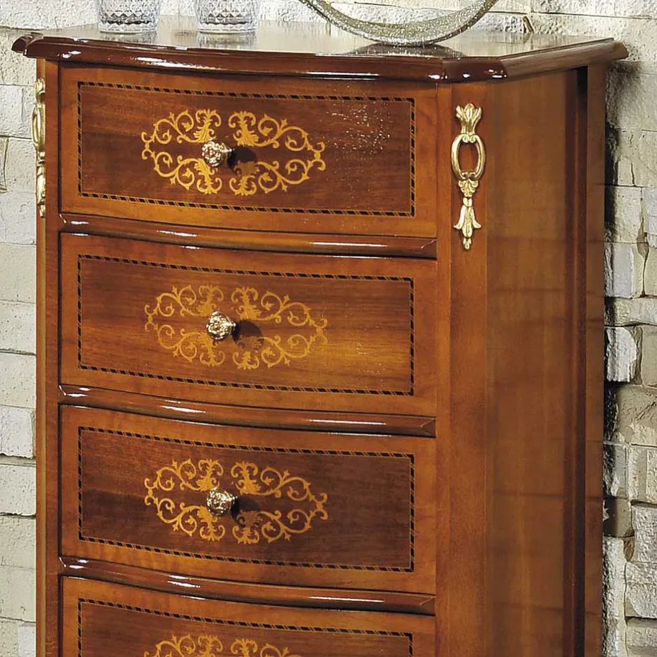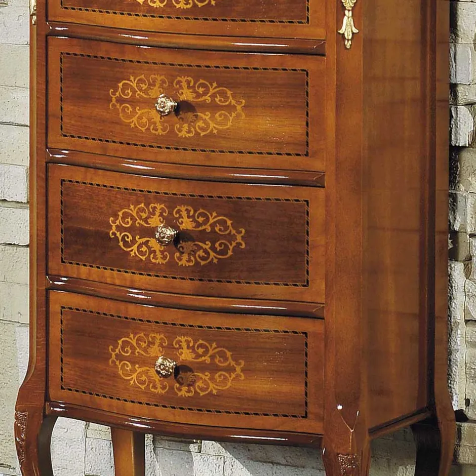 - Vier Schubkästen auf traditionellem Holzauszug mit dezent gerundeter Front und wertvollen Intarsien