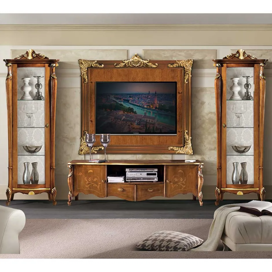 - Grandiose Wohnwand in Nussbaumfarben, Gold und Weiß