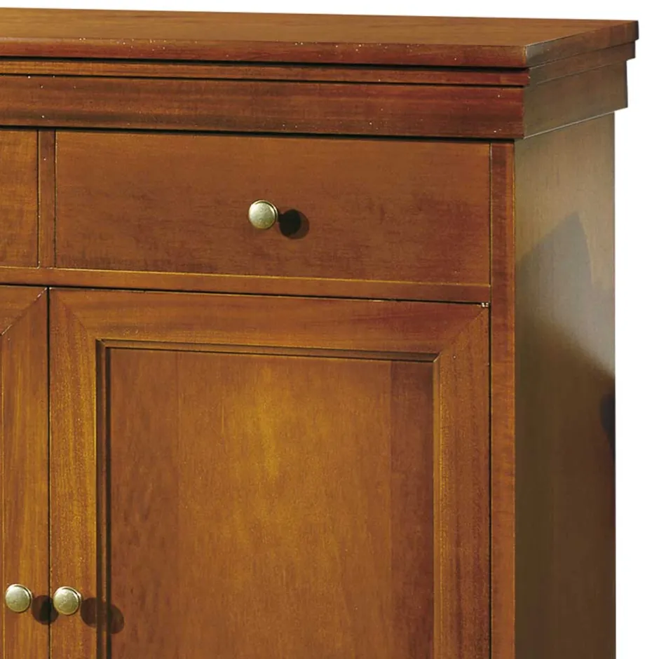 - Aus Tulpenbaum Massivholz (Rahmen und Gestell), Pappelholz (Schubladen) und MDF (Seiten, Deckplatte, Füllungen) gefertigt