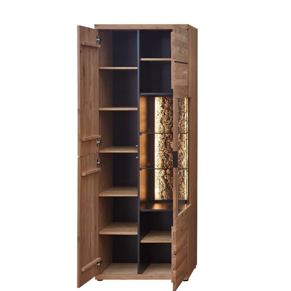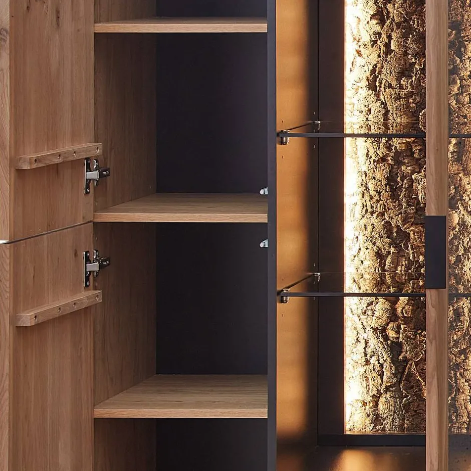 - Innen zwei verstellbare Glasböden, zwei verstellbare Einlegeböden und zwei Konstruktionsböden (rechts), fünf verstellbare Einlegeböden (links)