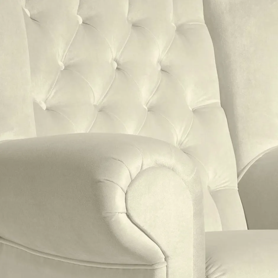 - Aufwändige Gestaltung mit seitlichen Ohren und Knopfsteppungen